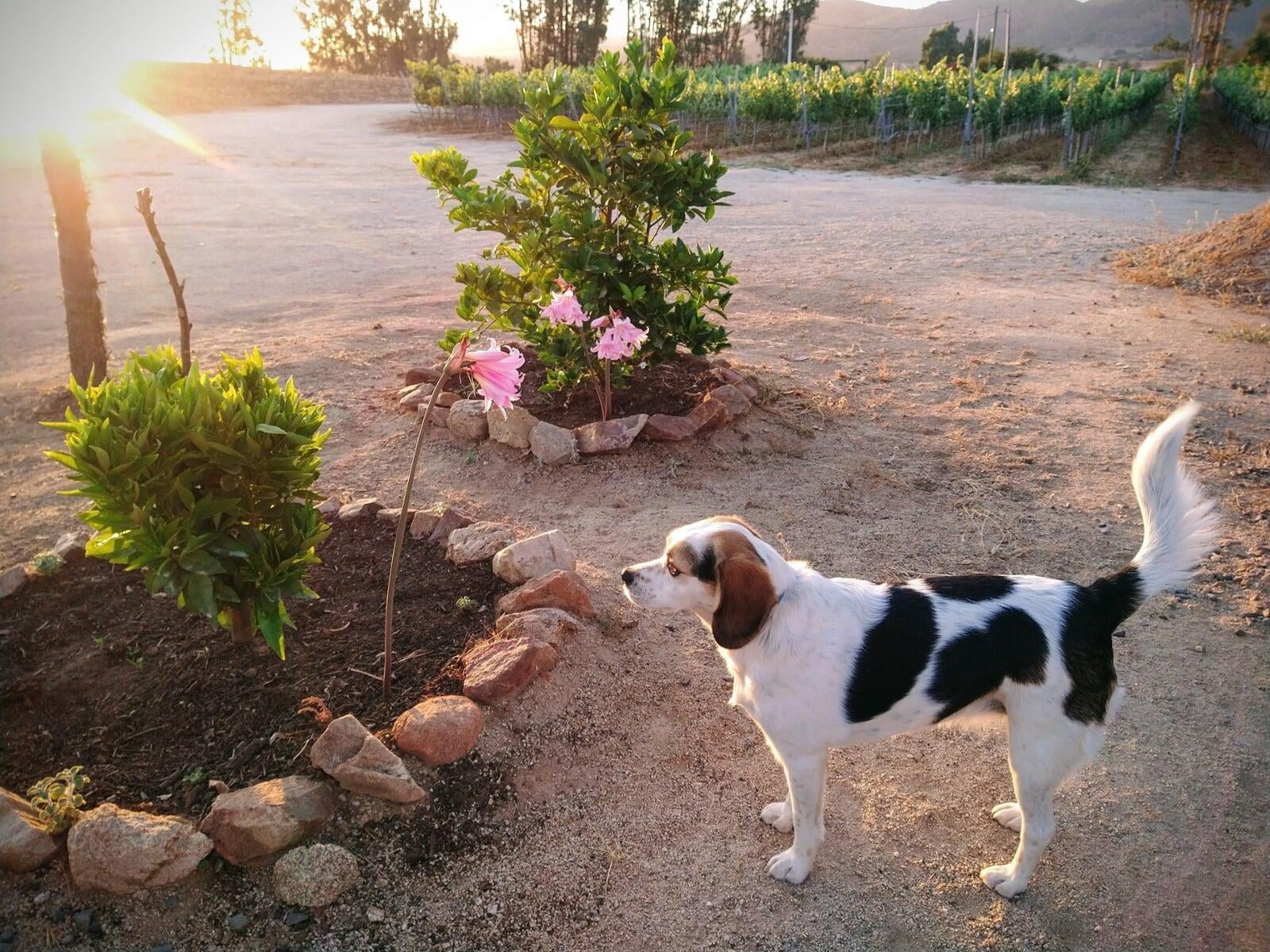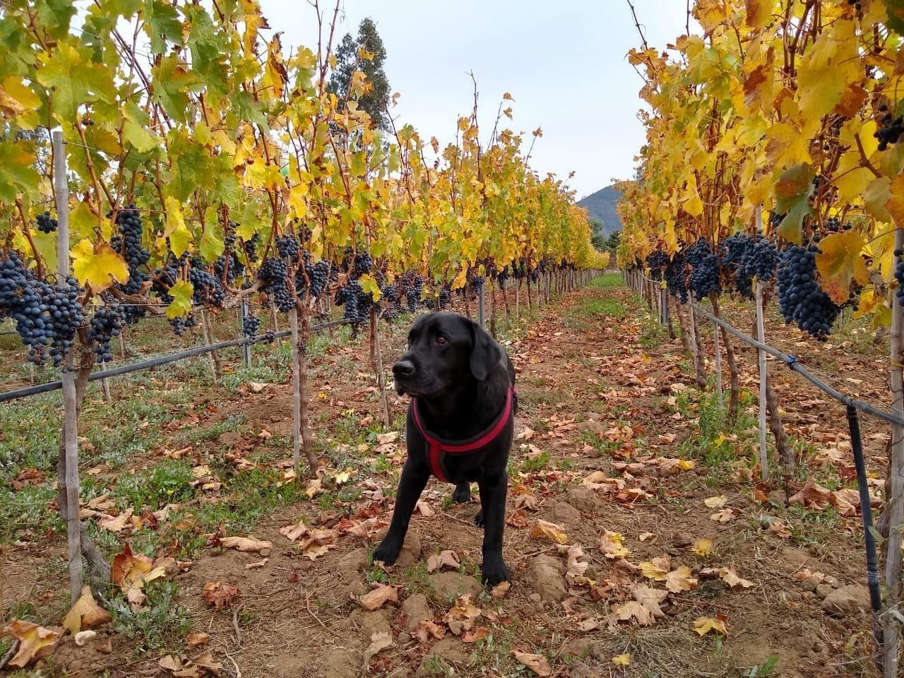 Parece tener algo de Beagle, eso explicaría su instinto explorador: todo el rato está por el viñedo, buscando a lagartijas y a los pobres conejos que osan entrar en su territorio.